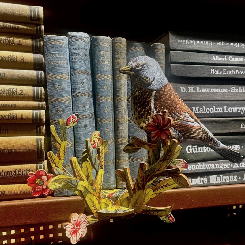 An unusual accessory for your home: a sweet fieldfare just perched on blooming branches.