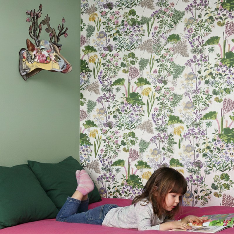 A blooming trophy in shades of pink and blue; spring flowers open from the antlers.