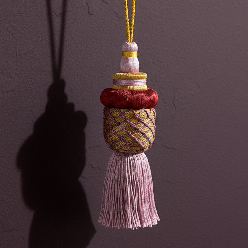 Unique and colorful passementerie details enrich this artisan tassel, perfect do decore any door, key or living space.
