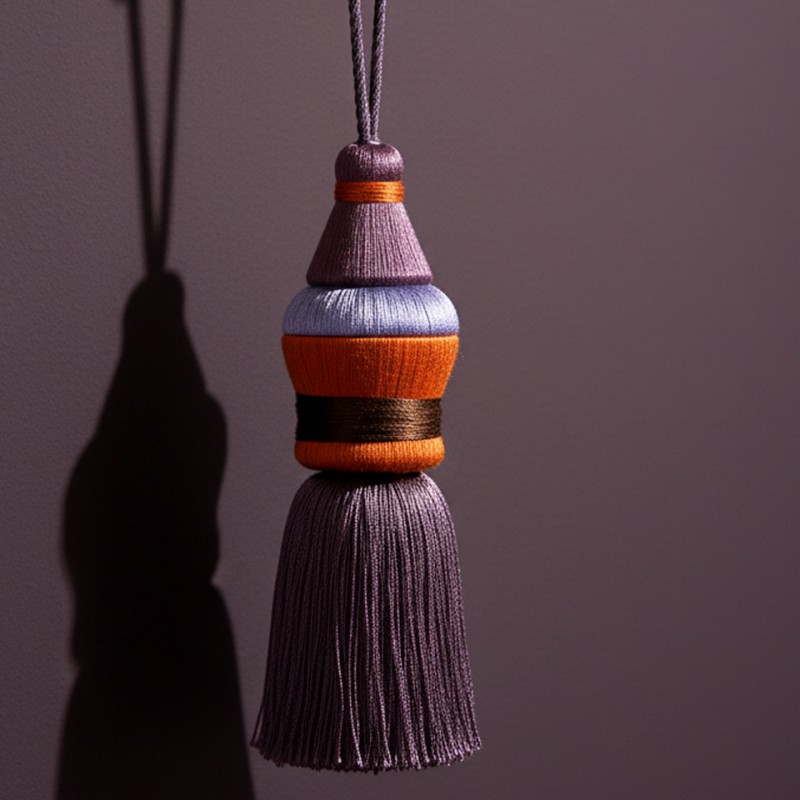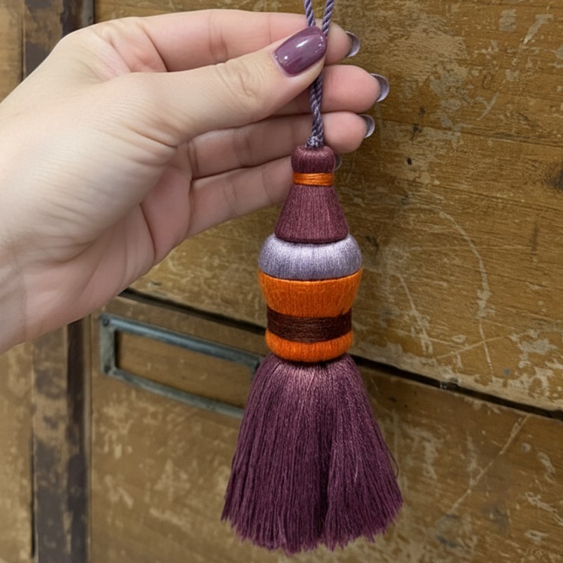 Unique and colorful passementerie details enrich this artisan tassel, perfect do decore any door, key or living space.