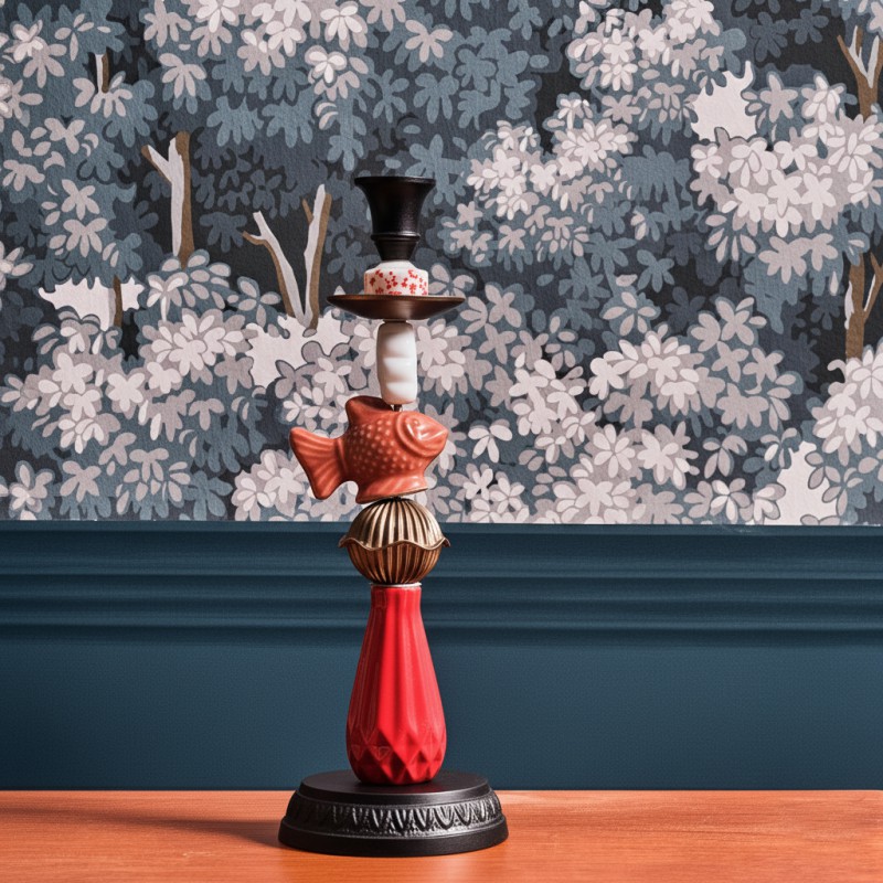 Un candelabro artigianale che sembra provenire da un mercatino di oggetti antichi, con la ricerca e il gusto di Miho. Ogni pezzo è una combinazione multicolore di forme e materiali diversi, perfetto per aggiungere una nota ricercata a una mensola o alla tavola.