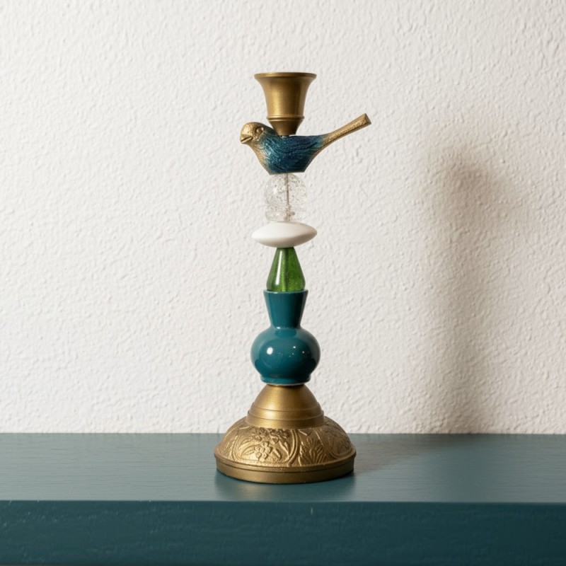 Un candelabro artigianale che sembra provenire da un mercatino di oggetti antichi, con la ricerca e il gusto di Miho. Ogni pezzo è una combinazione multicolore di forme e materiali diversi, perfetto per aggiungere una nota ricercata a una mensola o alla tavola.