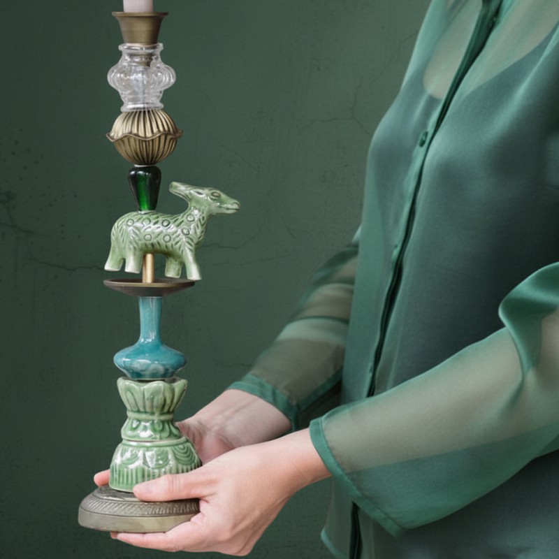 Un candelabro artigianale che sembra provenire da un mercatino di oggetti antichi, con la ricerca e il gusto di Miho. Ogni pezzo è una combinazione multicolore di forme e materiali diversi, perfetto per aggiungere una nota ricercata a una mensola o alla tavola.
