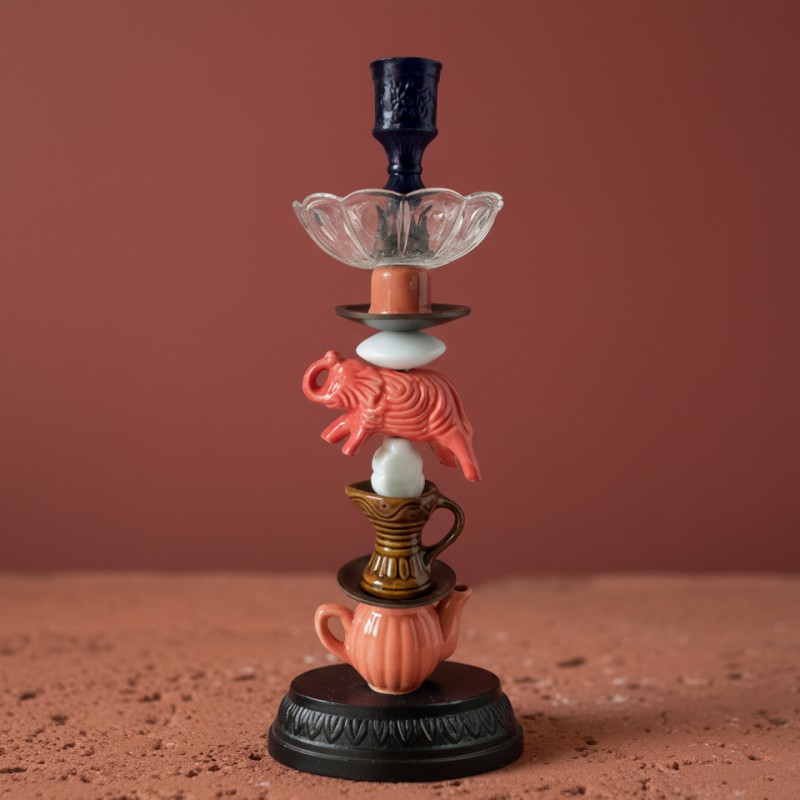 Un candelabro artigianale che sembra provenire da un mercatino di oggetti antichi, con la ricerca e il gusto di Miho. Ogni pezzo è una combinazione multicolore di forme e materiali diversi, perfetto per aggiungere una nota ricercata a una mensola o alla tavola.