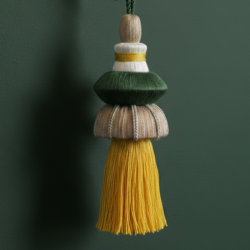 Dettagli di passamaneria unici e colorati arricchiscono questa nappina artigianale, perfetta per decorare qualsiasi porta, chiave o cassetto.