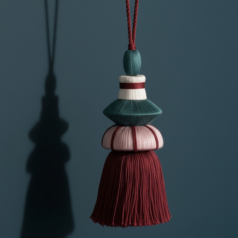 Dettagli di passamaneria unici e colorati arricchiscono questa nappina artigianale, perfetta per decorare qualsiasi porta, chiave o cassetto.